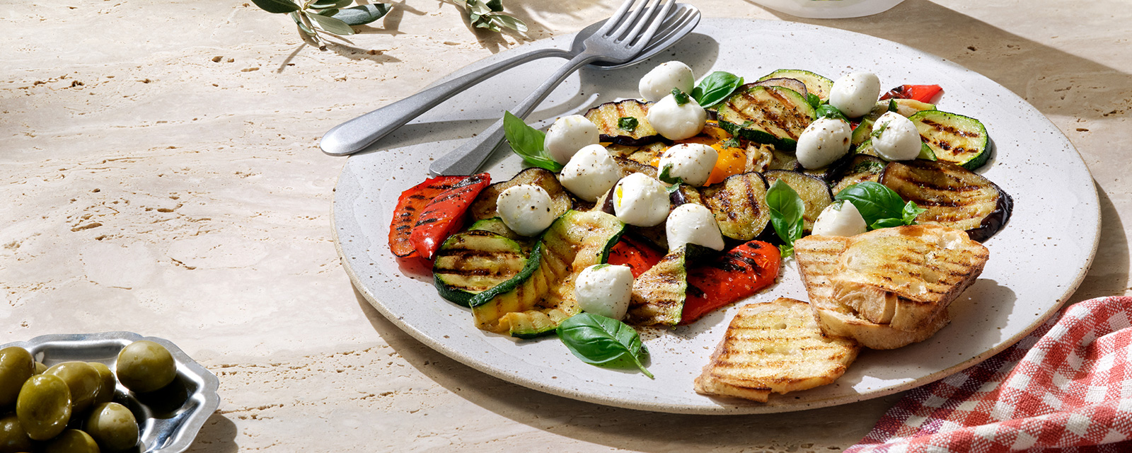 Grillede grøntsager med mini mozzarella. Enkel og smagfuld – og fungerer både som let måltid og som tilbehør.