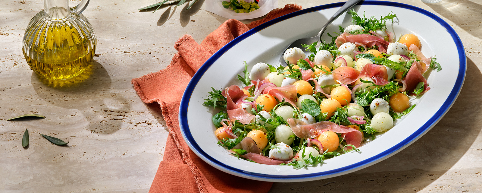 Klassisk italiensk sommersalat, hvor sød melon og salt parmaskinke mødes i perfekt balance.
